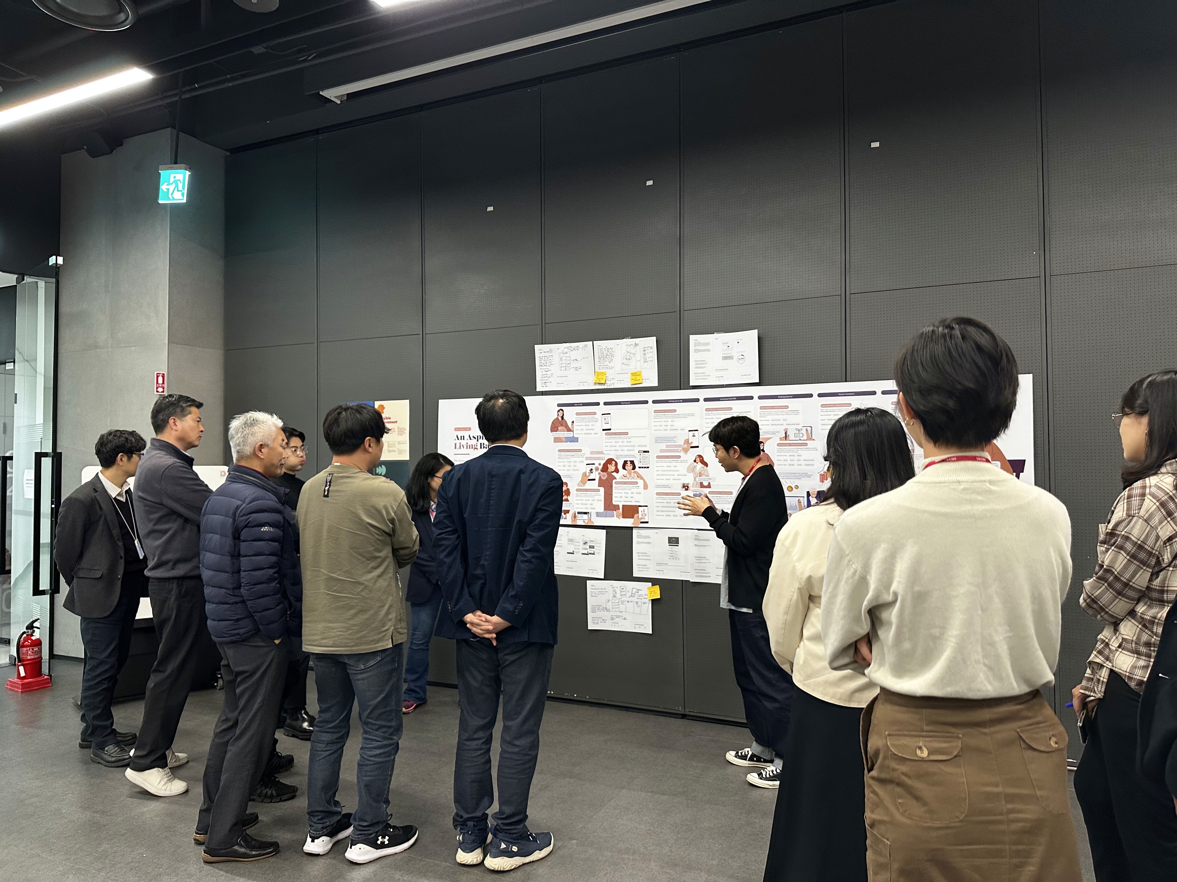 (right) The designer from LG CNS explains the concept poster of the interaction model that they learned during the design studio project.