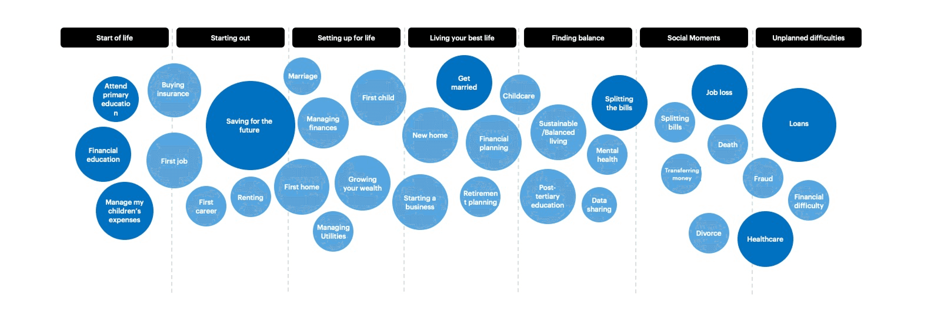 Framework demonstrating the different life stages of Korean banking customers and the key moments matter the most. The size/color of each circle represents the importance of each moment.