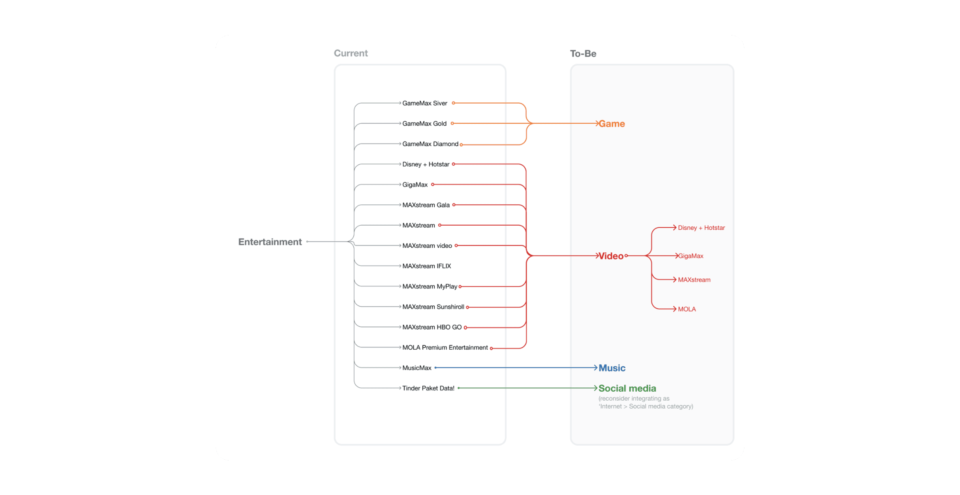 Sample visualisation of information architecture design of how to simplify the Entertainment products